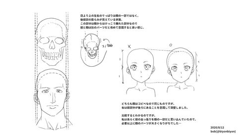 ずっと悩んでた問題で、顔を描くと目やら口やら顔のパーツが妙にデカくてすっきりしない…と思ってたんですが、どうやら頭と顔の構造を勘違いしていたことが原因だったらしいと気づいたので忘れないように覚え書きです pic.twitter.com/yvz3byKFDt — bob(@biy…